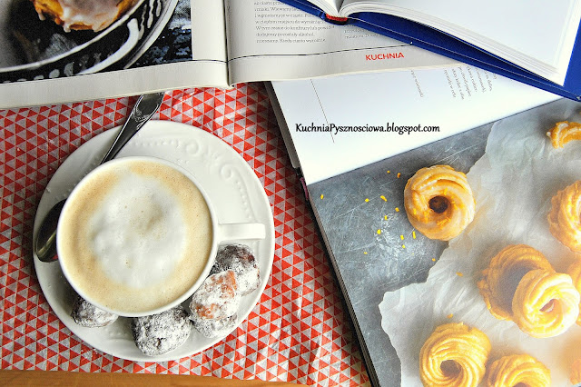 3. Gorące pączusie obtoczyć w cukrze pudrze wymieszanym z cukrem waniliowym. Jeść od razu w towarzystwie aromatycznej kawy.