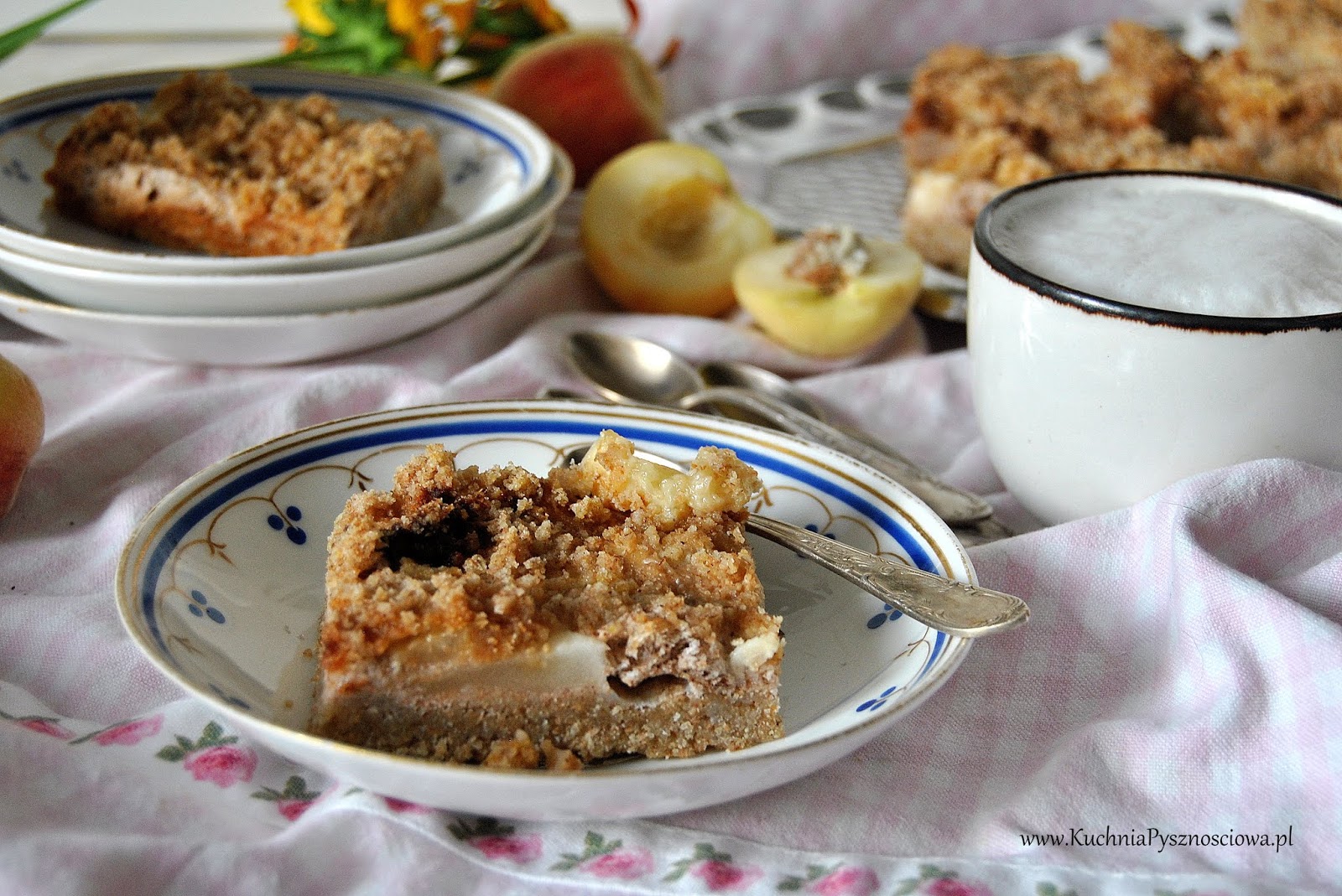 Więc tak sobie drepczę, mamrocząc pod nosem, że na pewno oni wszyscy zginą beze mnie. I jeszcze coś dorzucam o partnerstwie w związku kurna blaszka. Motyla noga, kurde balansik. I przy tym dreptaniu przydaje się czasem coś przekąsić. No bo ileż można tych kilometrów wyrabiać bez wspomagania. A że na robienie kanapek, sałatek, albo innych cudów, które brudzą talerze nie mam czasu i nastroju to chętnie łapię za kawałek ciasta. I właśnie takie ciasto orkiszowe z kefirem i brzoskwiniami jest idealne. Dodaje sił i energii i jeszcze nie powoduje wyrzutów sumienia. Dziabnę sobie kawałeczek i mogę dalej dreptać ten nasz kawałek świata.
